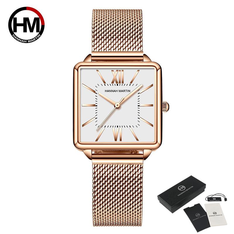 Hannah Martin Женские кварцевые часы Японский кварцевый механизм Зеленый циферблат Квадратные часы Модные наручные часы Женские часы из розового золота для женщин