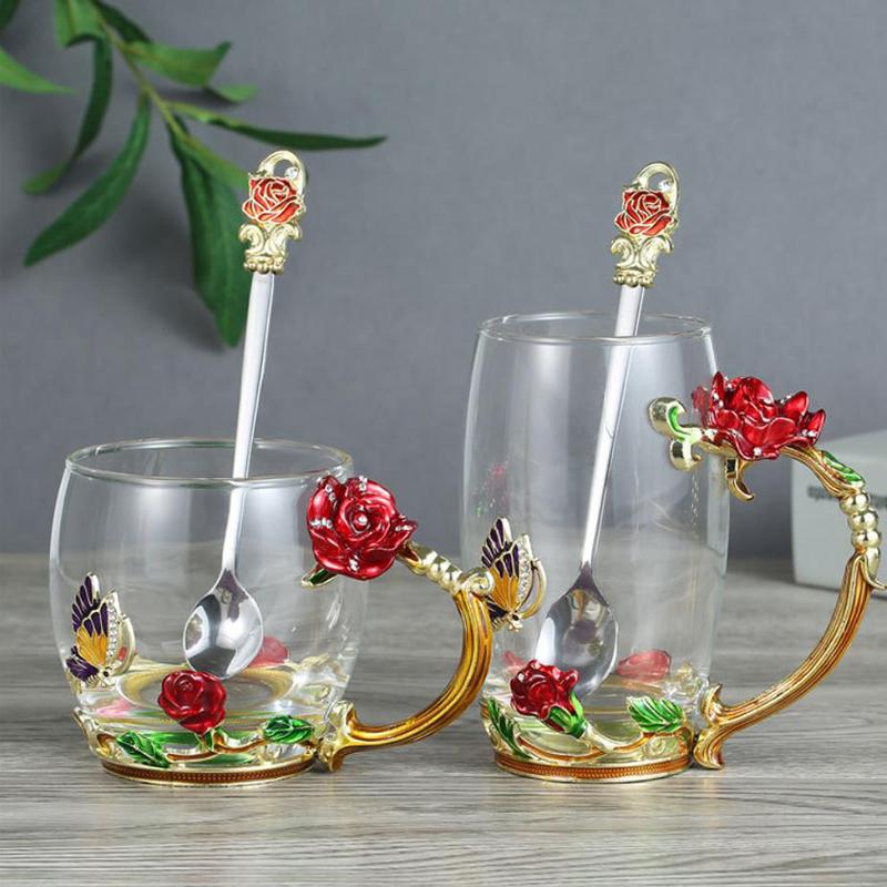 Термостойкая стеклянная чашка, кофейная чашка с розовой эмалью, кружка с цветком, чайная стеклянная чашка из сплава, ручка с ложкой и крышкой