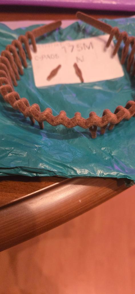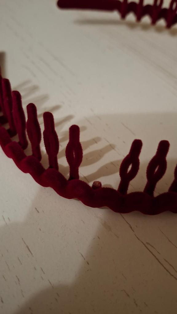 Хрупкий пластмасс, один зубчик уже сломался. На фото он кривой. Очень хлипкая конструкция, ободок недолговечный, волнистый верх в виде змейки покрыт бархатной крошкой.