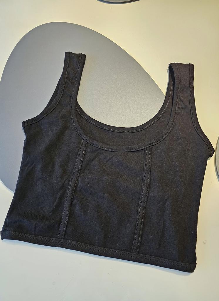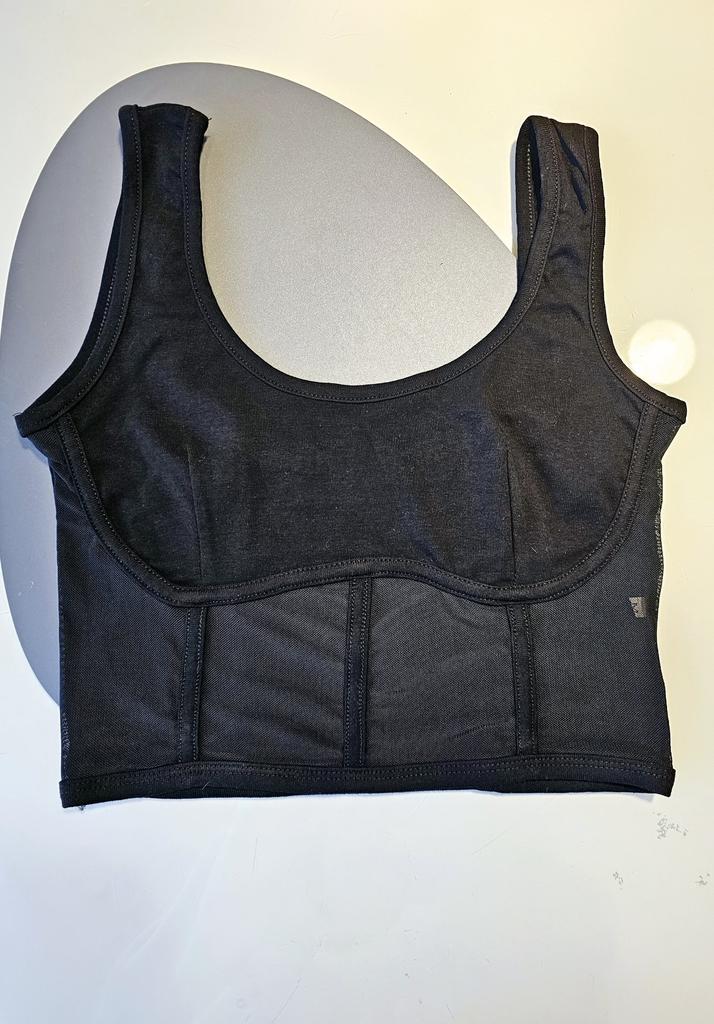 Корсетный топ без корсета. Мягкий топ. С сеткой по низу. На груди ткань в два слоя. Не просвечивает. Садится туго. Поэтому с бюстгальтером его не наденешь. Мне он мал в подмышках. На грудь до 90 его не надеть.