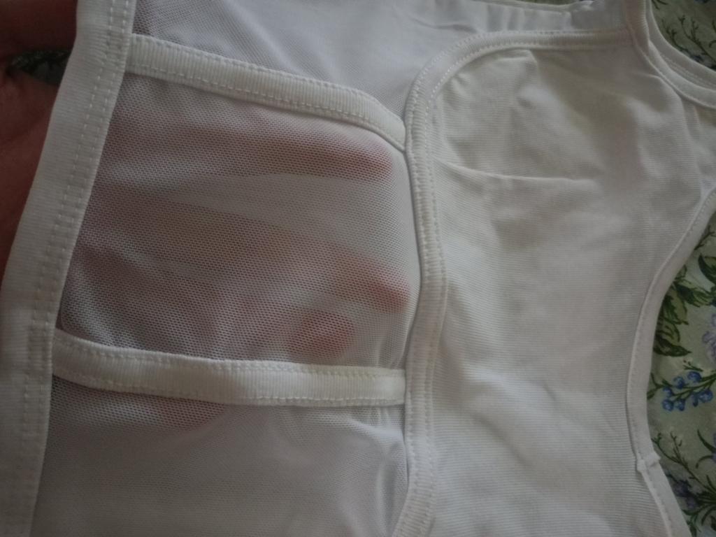 Материал мягкий. Область верхней груди закрыта тканью, но остальной перед слегка прозрачный. Сторона спины закрыта непрозрачной тканью. Кефтеме просто