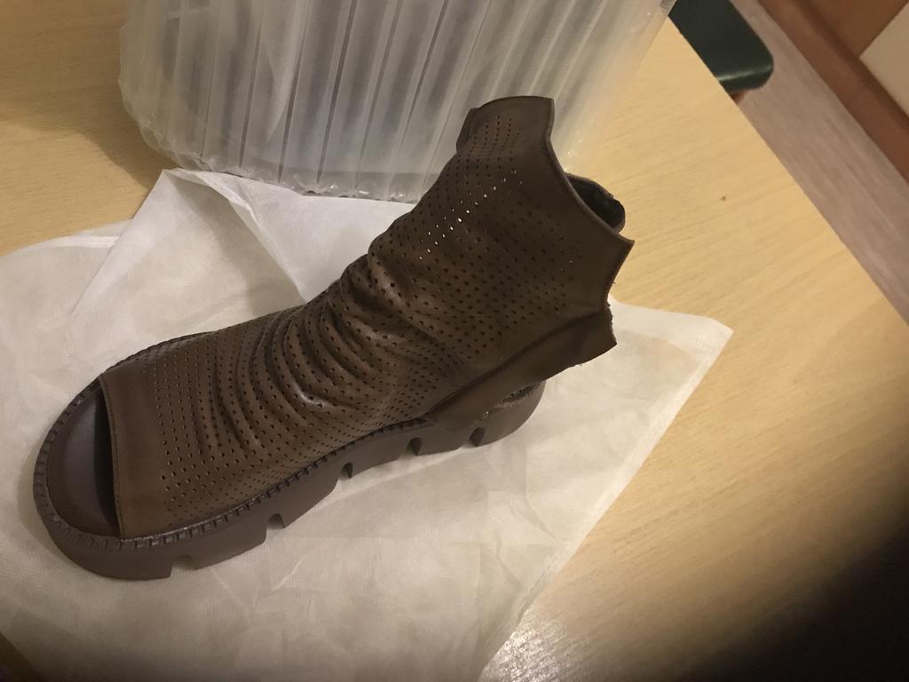 38 размер взяли на свой 37. Подошел по длине стопы хорошо. Но эта модель на сильно широкую стопу. У меня ноги называют лягушачьими лапками, но на мне болтаются. А поскольку стелька кожаная но скользкая, то, боюсь, что когда нога вспотеет, то будет скользить и набивать мозоли. На носок нормально, но ведь данная модель позиционирует хождение на босу ногу. Кожа замечательная, пошив великолепный, запахов неприятных посторонних нет. Упаковано при доставке прикольно.