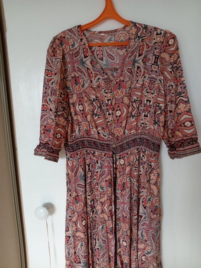 Хорошее платьице, лёгкое, воздушное, нарядное, удобное, красивое. Все лето в нем - ткань дышит,не синтетика :) на покупала до этого дорогих финн флеровских, они в шкафу висят, а это ношу- оно лучше оказалось. Хочу в другом цвете такое же второе купить, или похожее. На свой 46 взяла L, но можно было М брать. По длине - на мой рост 160см оно по щиколотку. Резиночка подчеркивает талию, но не сдавливает, очень комфортно. Надевать его можно через голову , не расстёгивая все многочисленные пуговки. Поясок с помпоном декоративный, затянуть его не получится, но с этим резиночки на талии и так справляются.