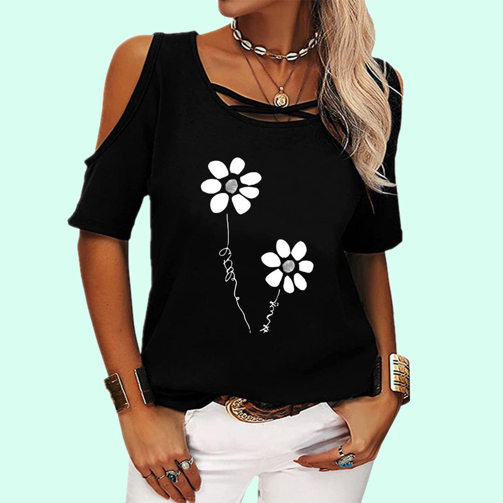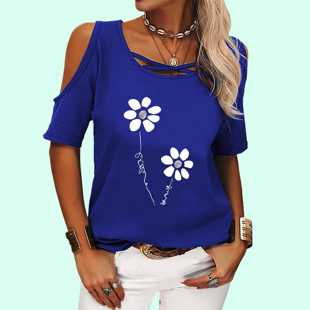 Женская повседневная футболка с открытыми плечами и круглым вырезом, летняя футболка с коротким рукавом и пуловером с принтом