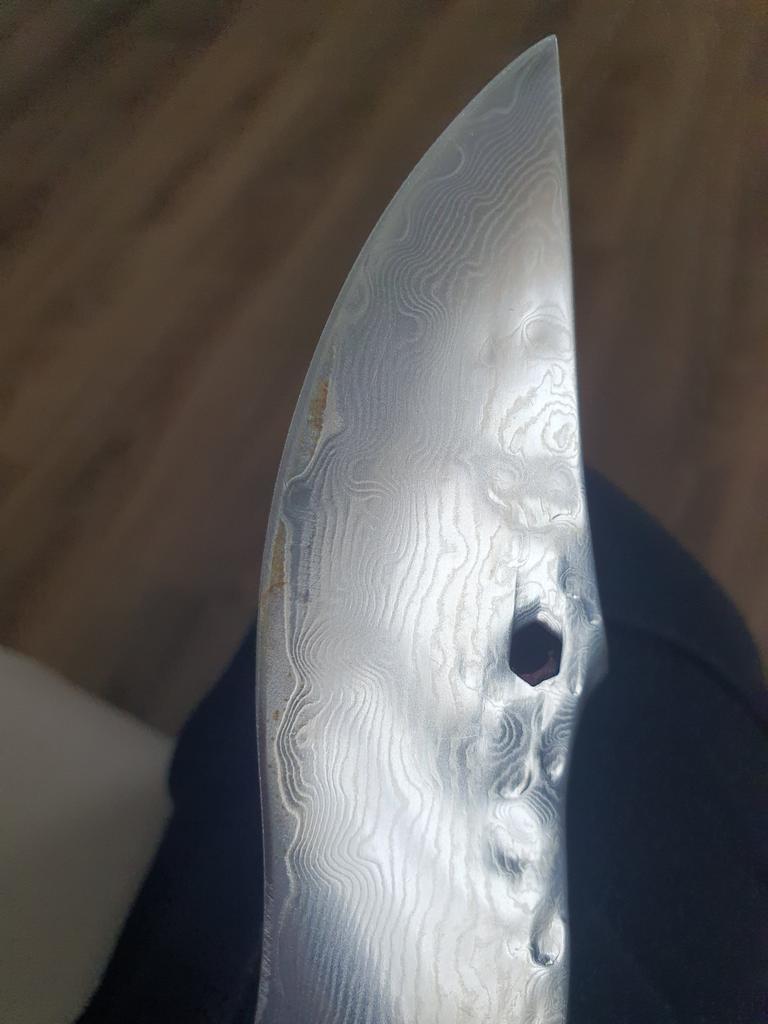 Деревянная гладкая ручка самого благородного вида, уже упоминавшийся чехол под кожу, и конечно,сам клинок!🥰 Так, наверное, выглядят клинки из дамасской стали: он достаточно толстый, с узором из выпуклостей и впадин, с тончайшим лезвием. Есть специальная заглушка из пластика на кончик ножа. И не зря! Муж, пока изображал из себя лихого джигита, и размахивал ножом, пребольно ткнул в ладонь концом ножа...
