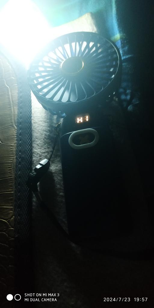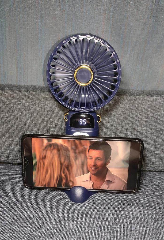 Доставка посылки быстрая, 16 дней. В посылке три заказа, мини ручной вентилятор без повреждений, всё как в описании продавца. Содержимое заказа: мини вентилятор на пять скоростей со светодиодным табло, аромат таблетка, кабель для зарядки, ремешок и подставка под вентилятор. Все режимы работают, был заряжен на 70%, заряд батареи происходит. Разрядил батарею до 5%, после чего заряжал аккумуляторную батарею до полной зарядки часов пять. При включении вентилятора в режиме первой скорости, батарея очень быстро разряжается (на фото видно процесс разряда по времени). Спасибо Joom за быструю доставку.