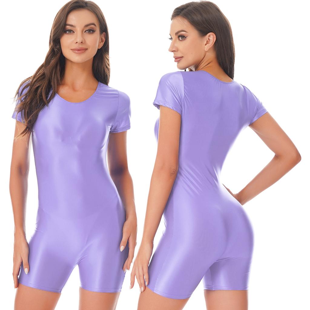 Женский глянцевый комбинезон для плавания с коротким рукавом, цельный купальник, шорты, комбинезон