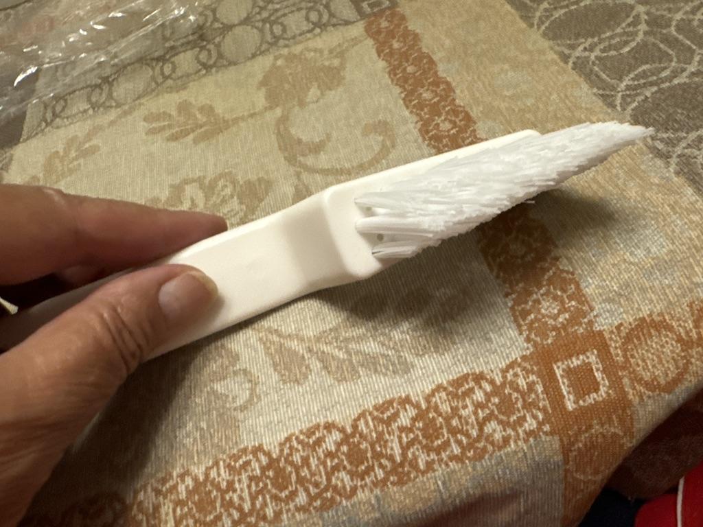 Щетка с острым краем специально срезанным для попадания в узкие щели. Думаю, можно использовать для чистки зазоров в нижней части оконных рам.