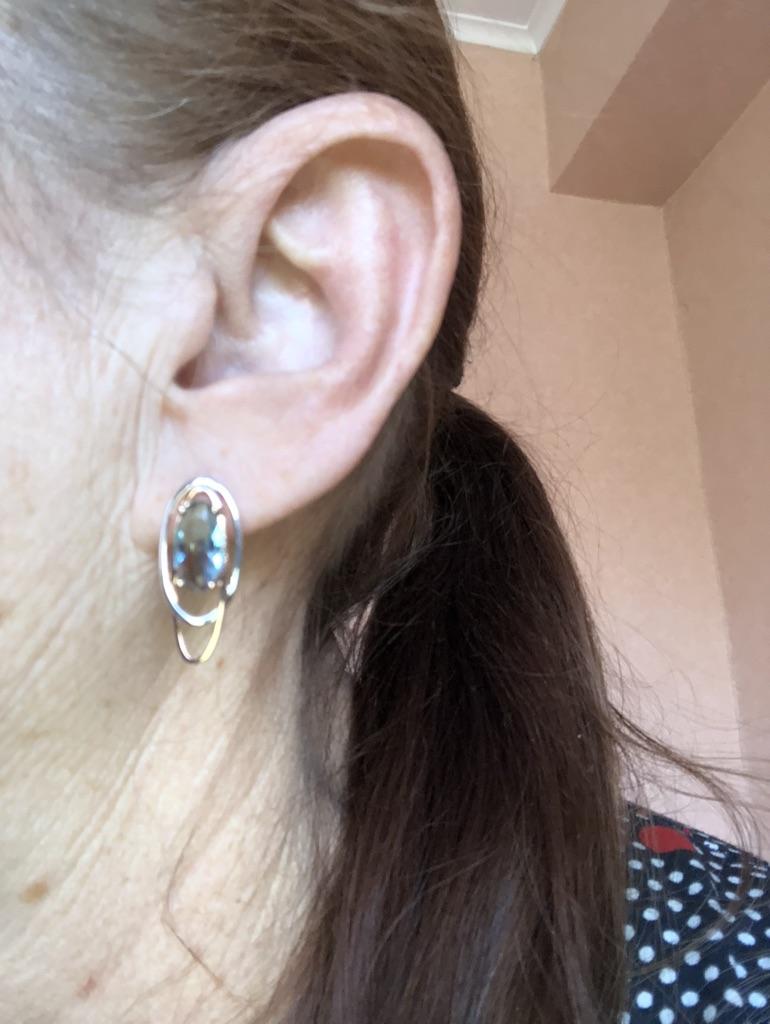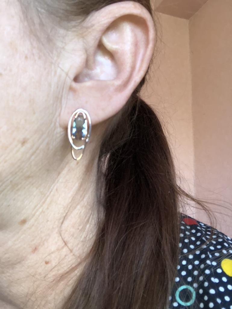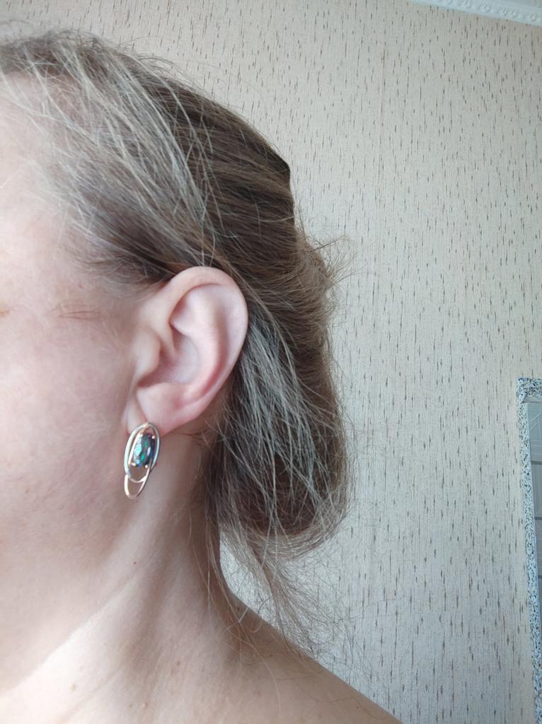 Овальные серьги с голубым переливающимся камнем, двойной овал выполнен из металла двух цветов, цвет серебра и розового золота, английский замок работает хорошо, несмотря на размер серьги смотрятся воздушно и легко из за дизайна. Я собрала комплект, смотрится очень красиво, спасибо магазину.