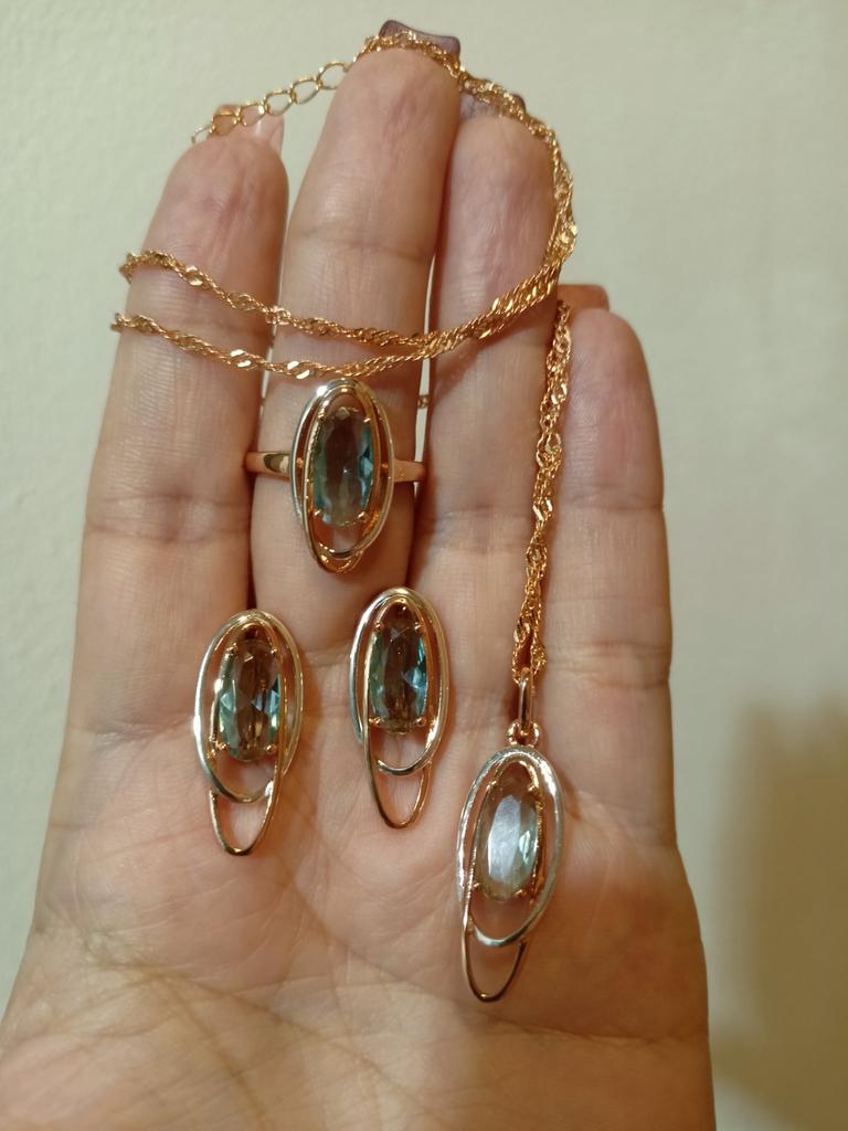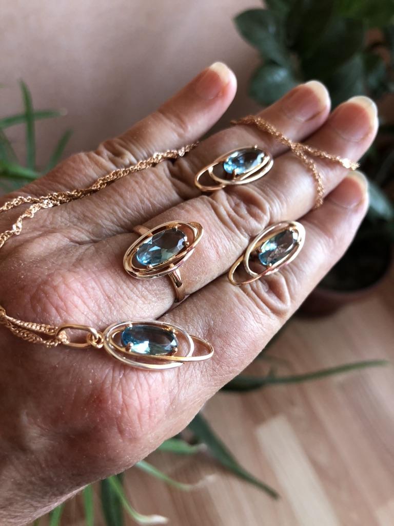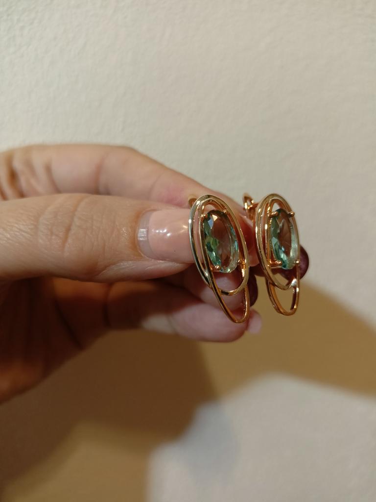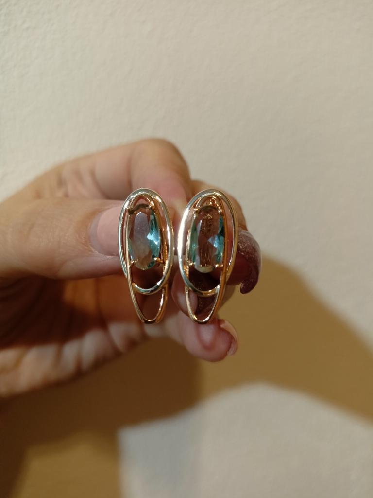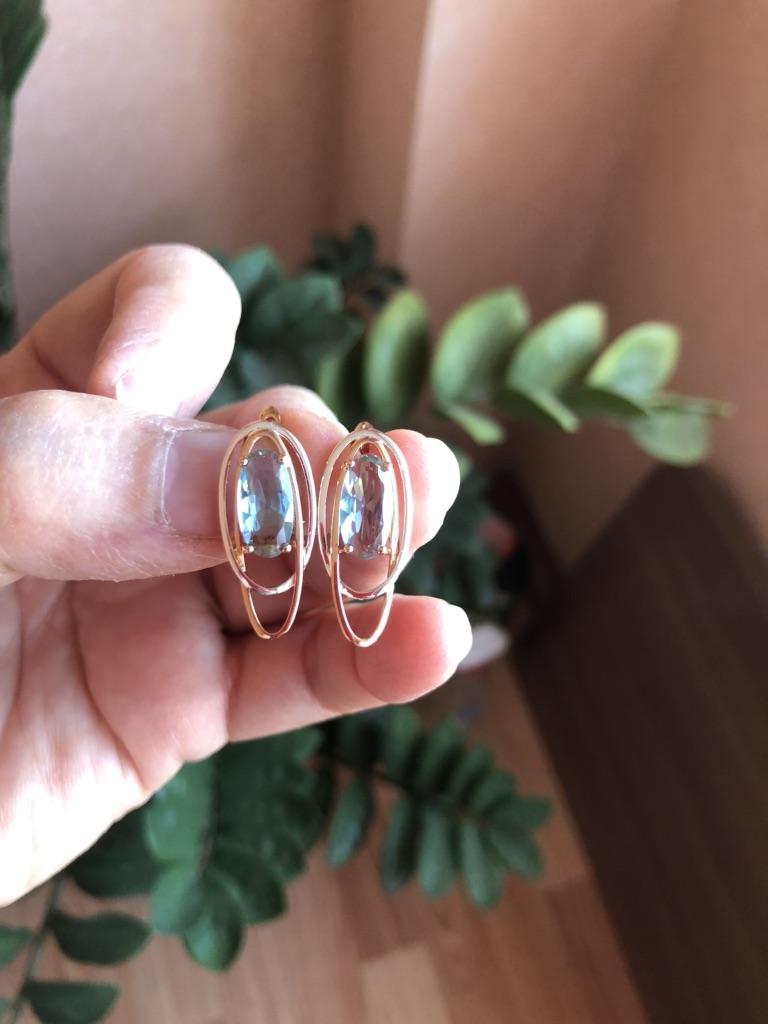 Серьги замечательные, заметные! Голубые камни сверкают гранями при движении. Дизайн оригинальный - выглядит как сочетание жёлтого и белого золота. Качество безупречное. Как настоящее ювелирное украшение. Купила весь комплект - и серьги, и кольцо, и кулон! Спасибо за такую красоту.