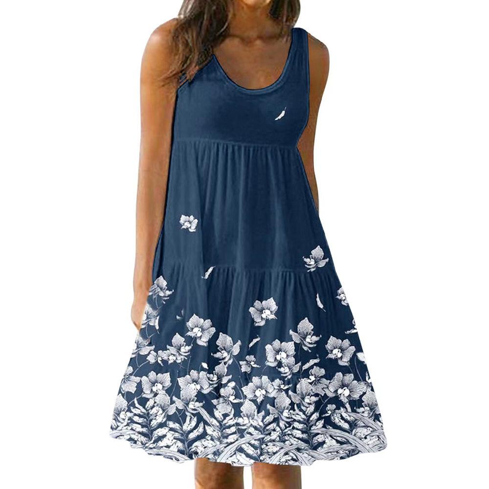 Модное женское летнее повседневное цельное платье без рукавов с круглым вырезом и цветочным принтом