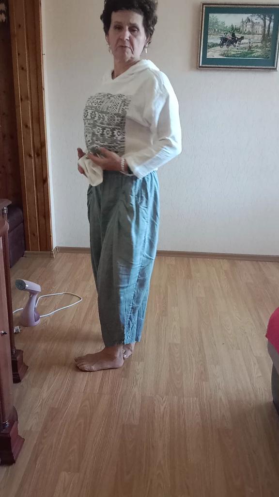 Долгожданные штанцы вызвали неоднозначное впечатление. Во-первых, цвет несколько темнее: на демонстрационном фото они жемчужно-серые, в реале серо-голубой оттенок, который с натяжкой отвечает заявленному цвету разве что на солнце. Во-вторых, фото производит впечатление, что ткань жатка, на самом деле обычная по фактуре ровная ткань, состав похож на натуральный. Кстати, ткань очень сильно мнется. В-третьих, заявленные параметры не соответствуют истине. Заявлена длина 91, а на деле 86 вместе с поясом (ну можно за счёт подгиба отиграть сантиметра полтора-два или спускать пояс пониже на бедра, впрочем, низеньким девочкам может быть длина и подойдёт. У меня рост 167, мне коротковаты); ширина в бедрах заявлена138, на деле - 156 (видимо они давали объем бедер без учёта складок на карманах). В поясе растягивается до 100. Так что, девочки, у кого бедра 100 и больше - вы просто не пролезете в пояс, это учитывайте. Ткань заявлена льняная, но я ооочень сильно сомневаюсь, что это чистый лен. Может в составе и имеется, но точно не стопроцентный. Что же касается сезонности штанов - вполне себе на жаркое лето очень подходят, а также на тёплую осень-весну. Носить буду конечно, но не с таким удовольствием, ибо, конечно, обманулась в ожиданиях. Ну конечно придется отпустить нижний подгиб штанин, потому что если они после стирки подсядут - вообще клоунскими будут выглядеть. Рекомендовать воздержусь. Впервые разочарована товаром Джонэйче . Всем добра и удачных покупок. P.S. Службе поддержки спасибо за оперативное решение в конфликтной ситуации.