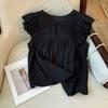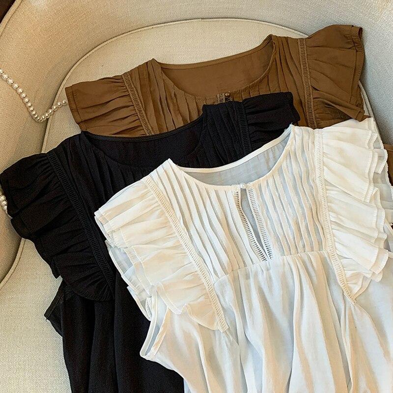 Летняя женская рубашка без рукавов с рюшами, элегантная корейская плиссированная хлопковая блузка, женские однотонные повседневные топы с круглым вырезом, свободные Blusas 26891