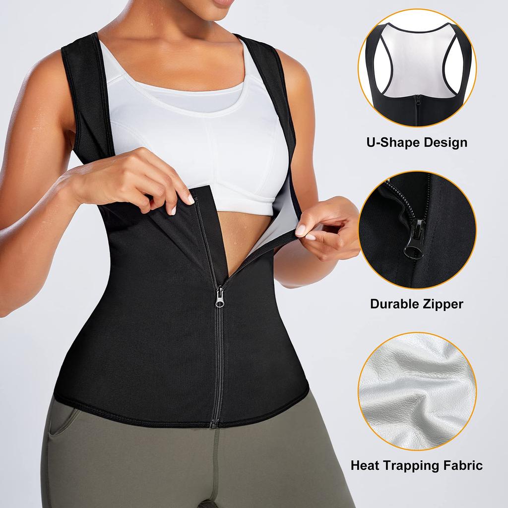 · 【 SAUNA SWEAT BODY SHAPER 】Жилет для тренировки талии для женщин предназначен для стимуляции пота в 3 раза во время тренировки, используйте уникальную серебряную полимерную ткань, помогайте сжигать калории и жир на животе, сохраняя тепло тела. Идеально подходит и плотно облегает ваше тело, и вы можете начать чувствовать, как пот накапливается, когда вы делаете кроссфит-тренировки или другие виды спорта, определенно удвоенные, чтобы утроить производство пота!