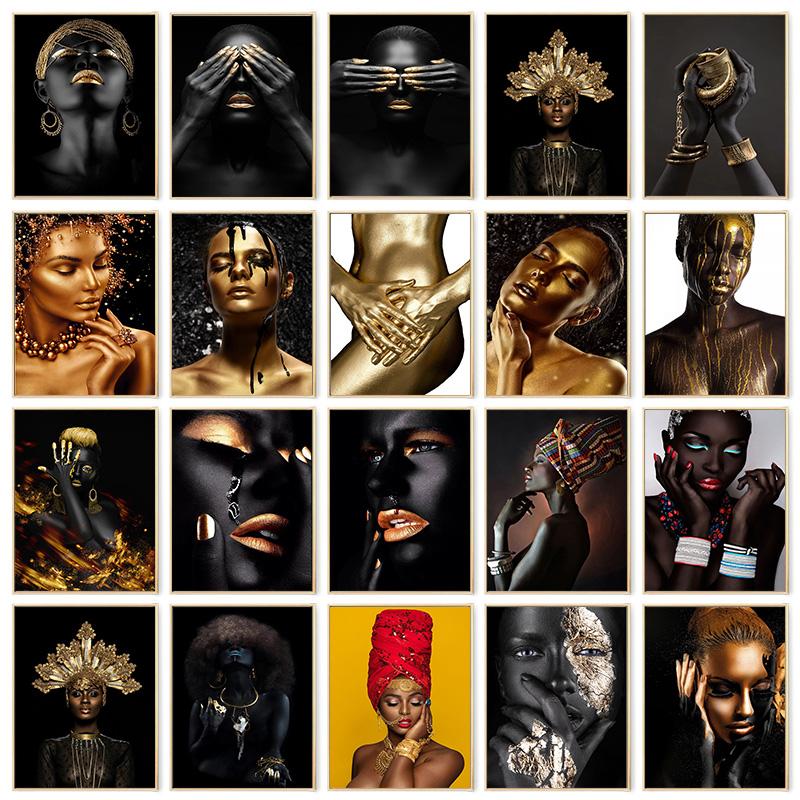 Черно-золотой африканский художественный постер с принтом, женская картина на холсте, настенная живопись Cuadros, скандинавское украшение, домашняя картина для гостиной