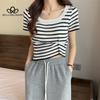 Новый летний универсальный облегающий свитер в полоску с квадратным воротником и короткими рукавами, женская верхняя модная повседневная футболка