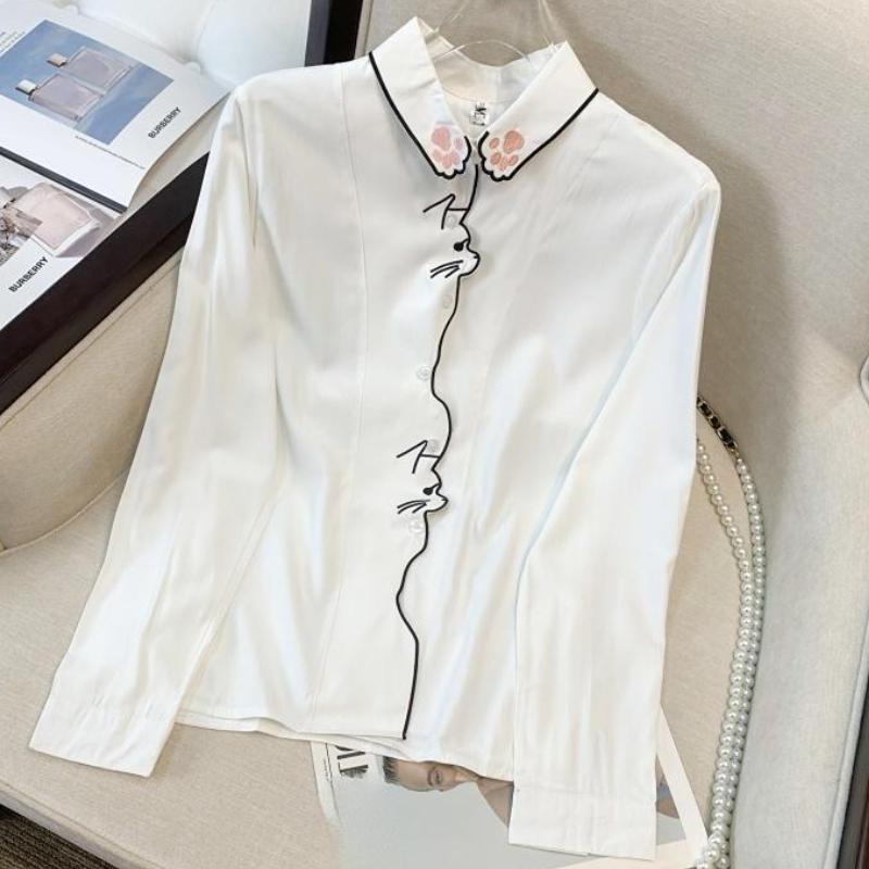 Женская одежда, блузки, рубашки с вышивкой, кошачий узор, белые рубашки, женские топы, повседневная женская одежда с длинными рукавами, рубашка женская