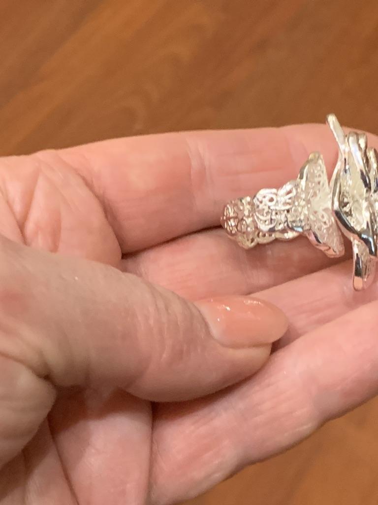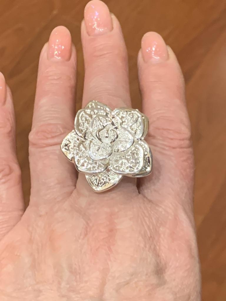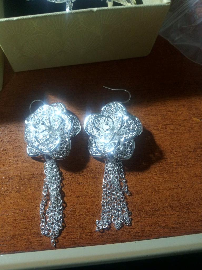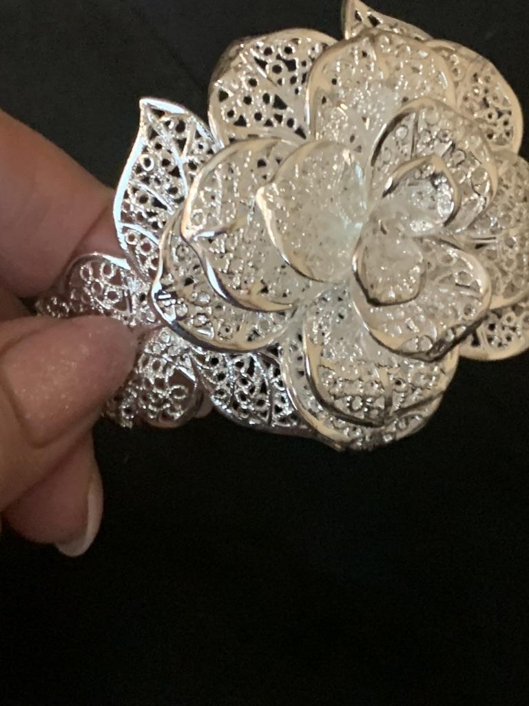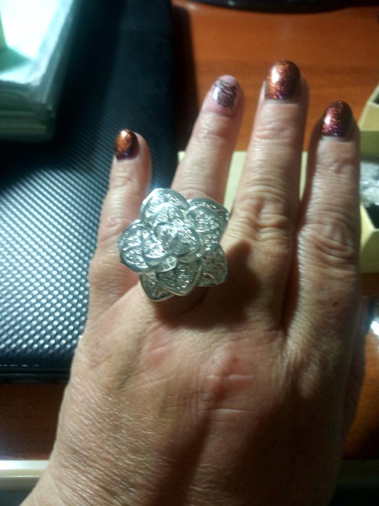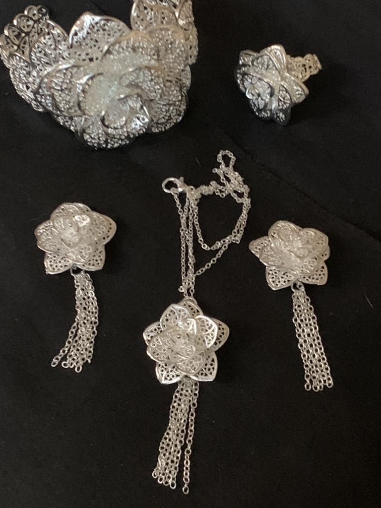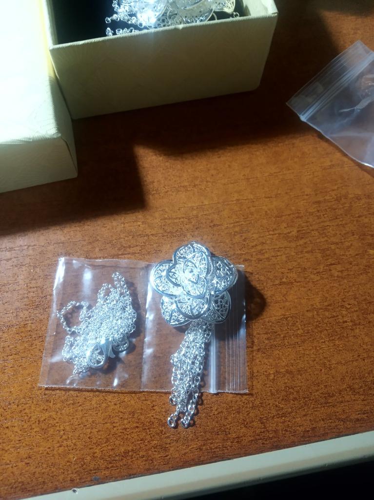 Комплект красивый. Правда, сомневаюсь, что серебро. Очень нежный, цепочка отдельно от кулона. Кольцо массивное и тяжёлое. Мне на пальце кажется слишком большим, но это на любителя. Заказала ещё два браслета. Получился довольно яркий комплект. Облезет или нет, покажет время. Повторяюсь, сомневаюсь, что серебро, скорее всего напыление.