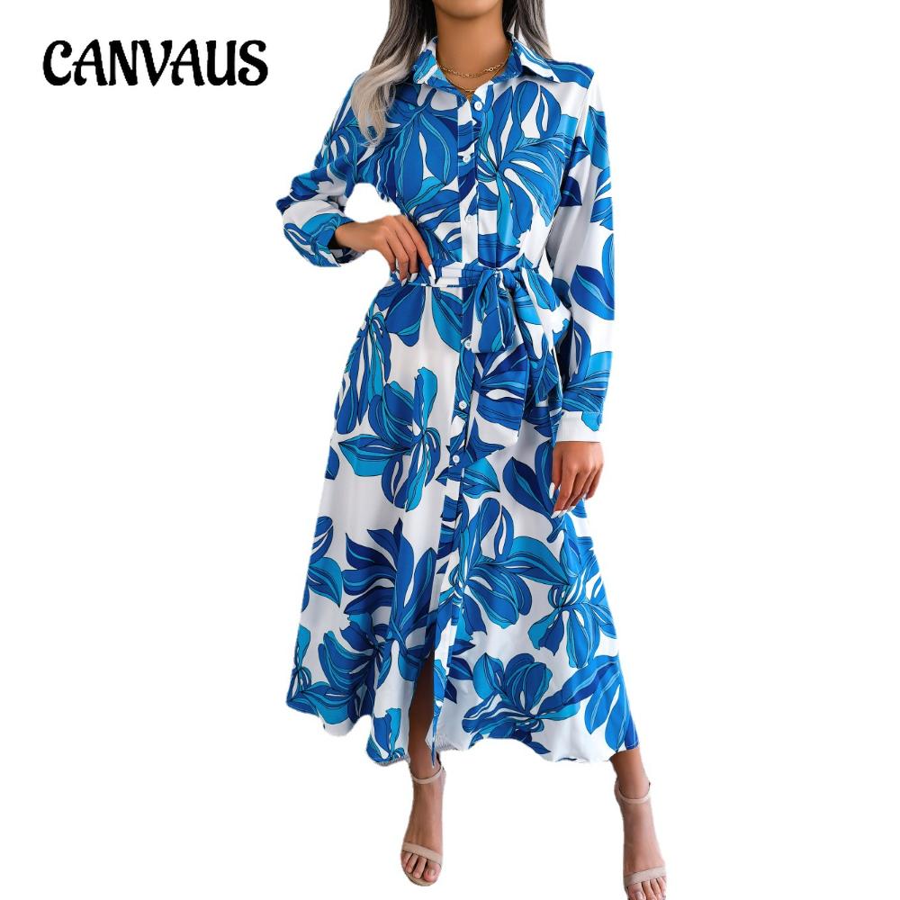 Весеннее и осеннее женское платье, платье-рубашка с цветочным узором и лацканами, длинное платье