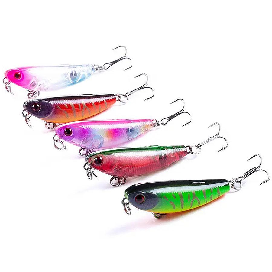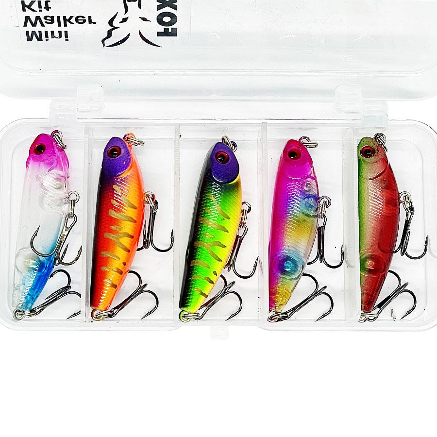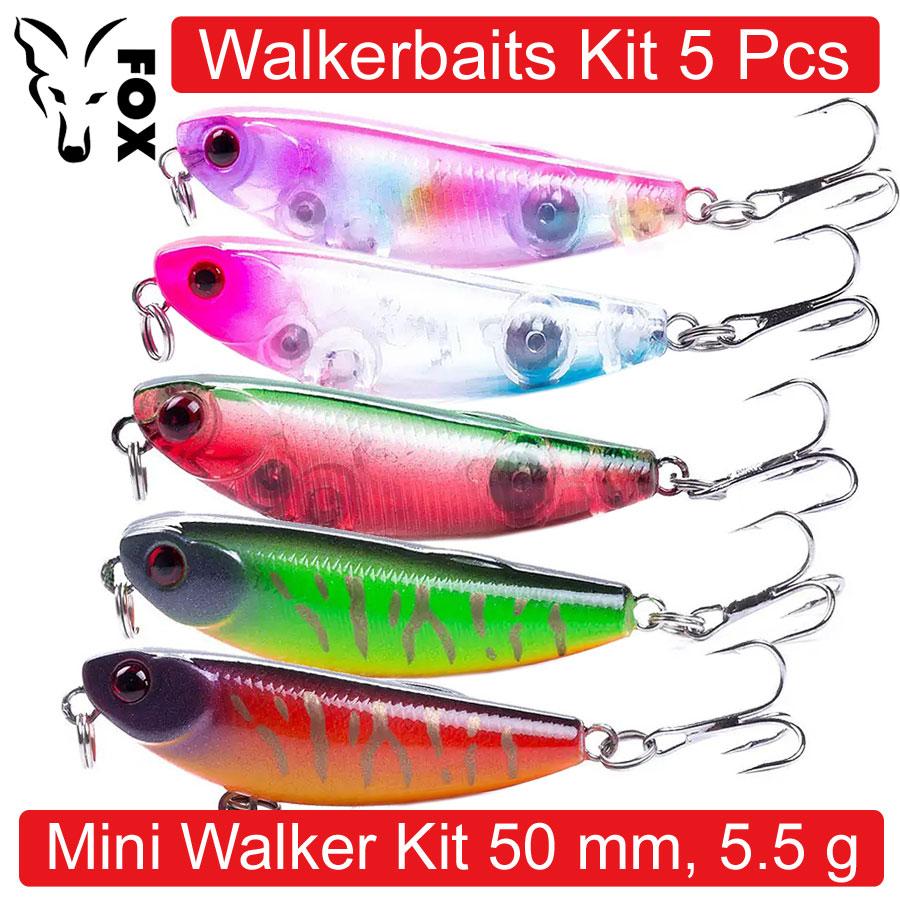 FOX Mini Walker Kit - это набор из пяти миниатюрных уокеров в уловистых привлекательных расцветках, специально подобранных для удачной "охоты" на окуня, голавля и форель в течение всего сезона открытой воды. Также этими соблазнительными приманками не побрезгуют щука и судак. Все воблеры в наборе оснащены 3D Simulation Fisheye глазами, экстра острыми тройными крючками High Carbon Steel Hook #8 и шумовыми шариками.
