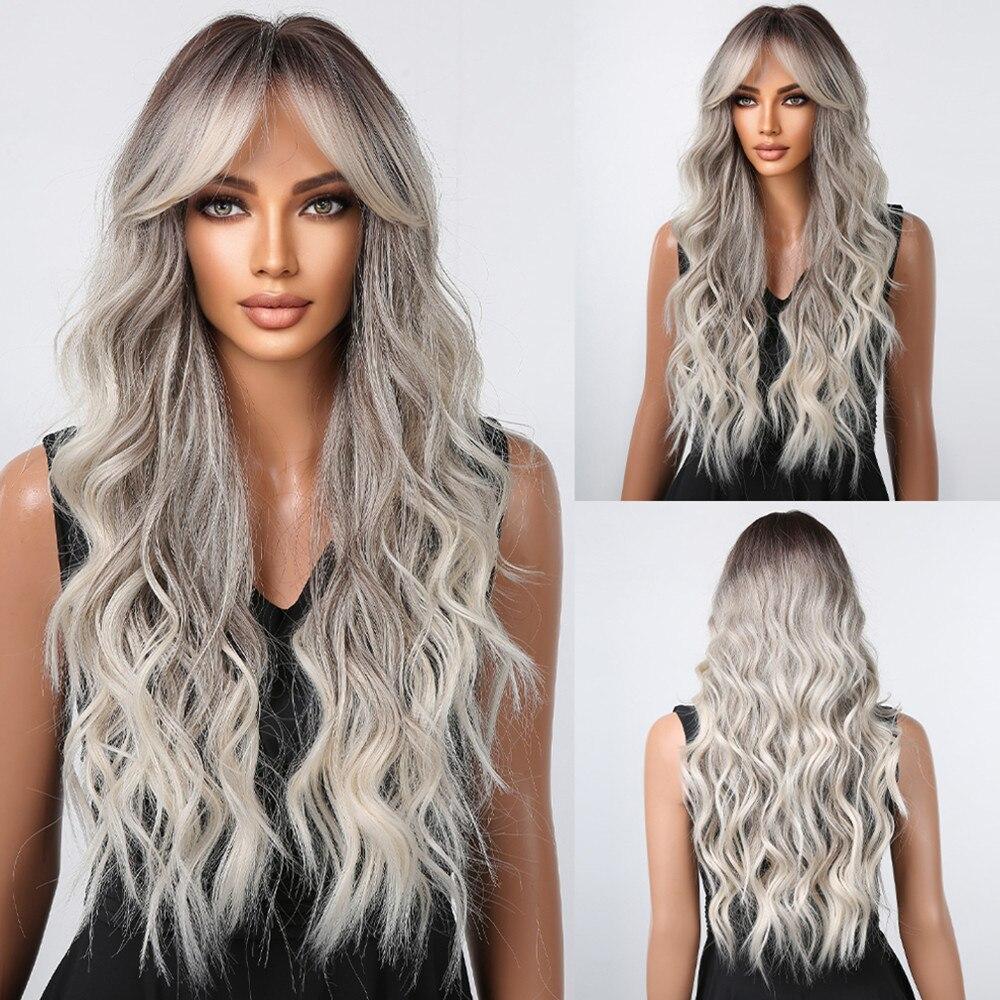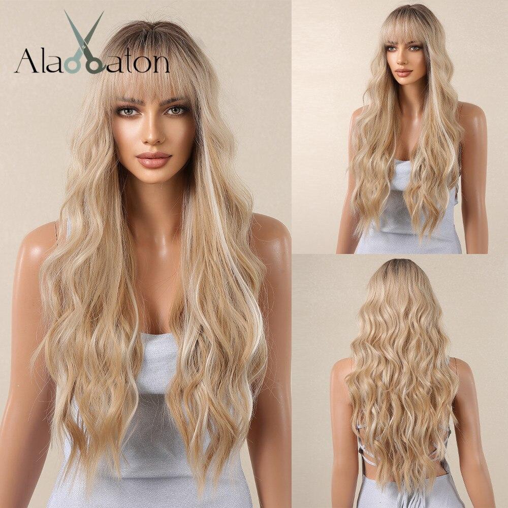 ALAN EATON Блондинка Длинные вьющиеся синтетические парики с челкой Ombre Blonde Highlight Wave Wig Натуральные женские повседневные волосы Высокая температура
