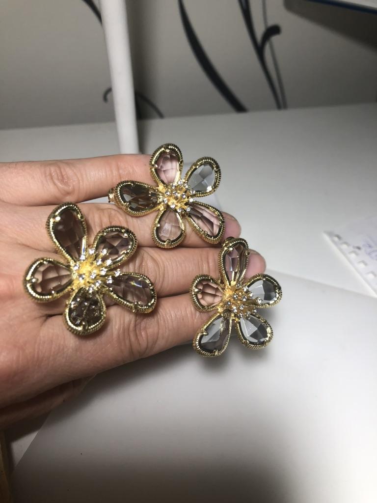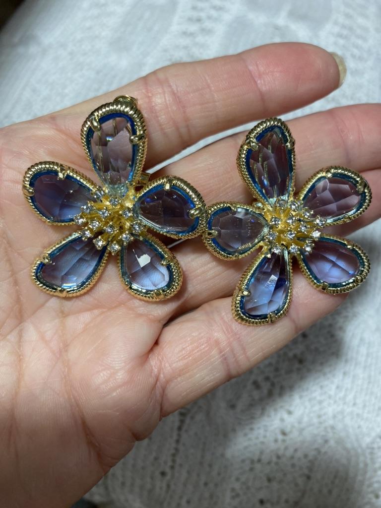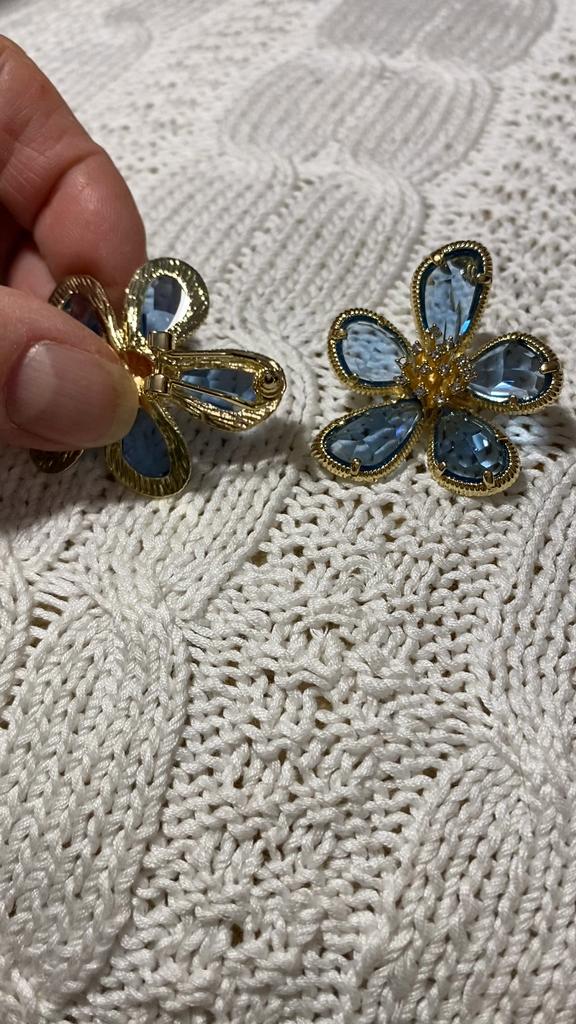 Изумительные серьги! Крупные, стильные, смотрятся достойно, дорого. Позолота лимонного цвета, лепестки цветка выполнены из голубых камней, которые выглядят, как топазы. Тычинки украшены белыми цирконами. Серьги на итальянском замке (омега), когда в ушко вставляется прямой штифт, сзади не защелкивается, а поджимается подвижной дужкой с широкой петлей-зажимом. Но у данных сережек для повышения надежности на штифт надевается еще и стоппер. Единственный минус, как мне кажется, это слишком тонкий штифт, для таких сережек нужен штифт потолще соразмерно весу сережек.