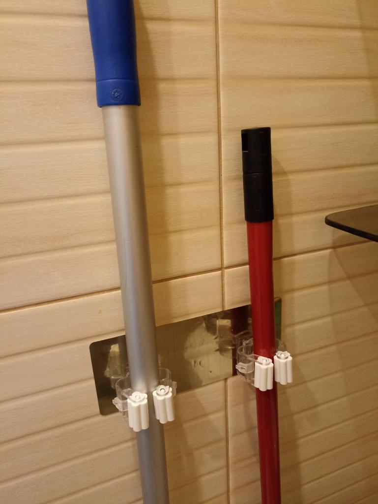 Практичная вещь. Подойдет для швабр с не очень толстой палкой. Клеящаяся основа несколько хлипковата и поэтому пришла малость деформированной, но приклеилась и, на первых порах, кажется, надежно. Основа не совсем серебристого, а золотистого цвета. Для покупателей, которым важна эстетика, следует этот момент учесть. Меня это несколько расстроило, так как ручки у моих швабр серебристые.