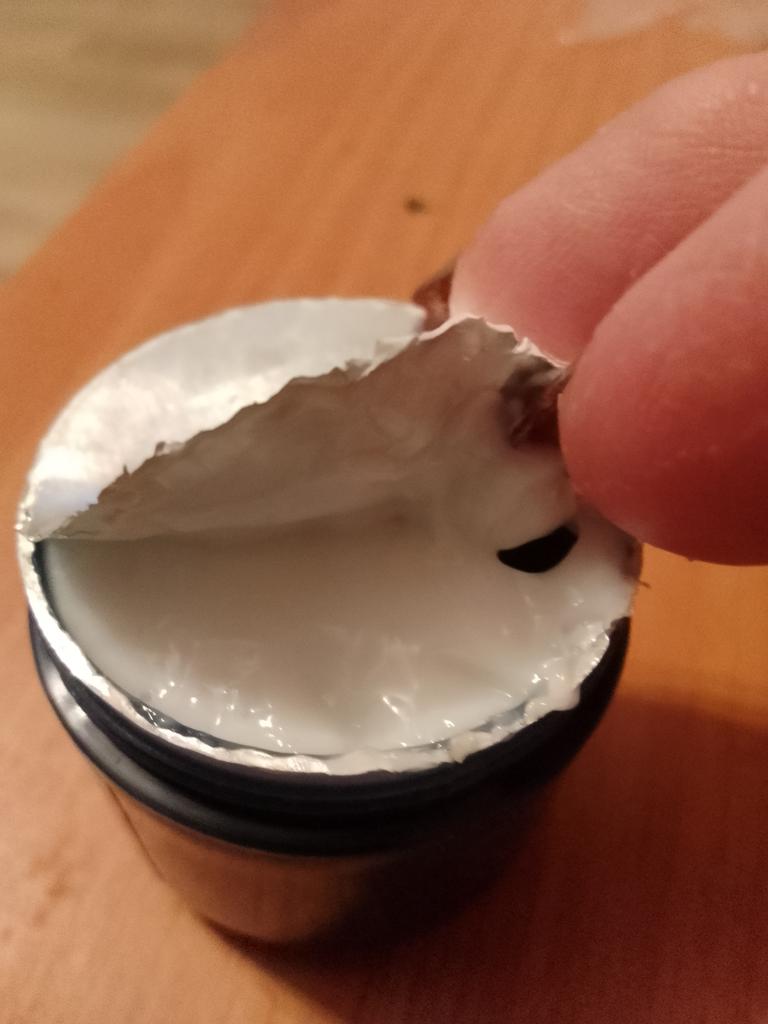 Коробочка чуть помята , внутри баночка из приятного пластика. Приятно, что и коробочка в термоусадке, и на баночке контроль первого вскрытия. Крема - до самого верха, на фото последнем это уже крем, а не второй слой защиты. Текстура легкая, хорошо впитывается и не оставляет липкости. Попробовала на руке, визуально заметна разница - сужает поры, маттирует и подтягивает кожу. Как будет в применении по назначению покажет время, но предварительно я настроена на успех: крем выглядит как хорошая покупка. Найду и закажу полноразмер, если не вылезет какая-нибудь побочка. А пока - рекомендую и товар, и продавца :)