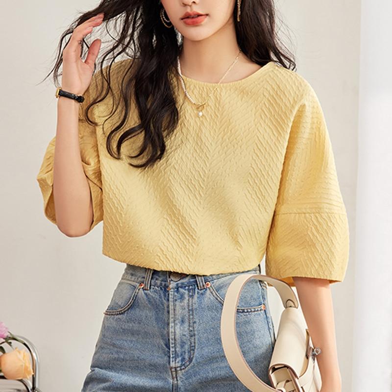 Повседневная рубашка с короткими рукавами-фонариками, летняя модная однотонная желтая женская рубашка с круглым воротником, хлопковая блузка, одежда Blusas 27743