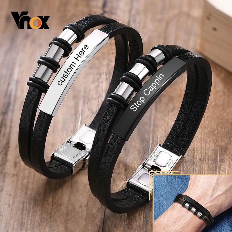 Мужской кожаный браслет Vnox по индивидуальному заказу, черный кожаный браслет с бусинами, браслеты с персонализированным логотипом для женщин, подарок для — купить товар онлайн с бесплатной доставкой до всему миру!