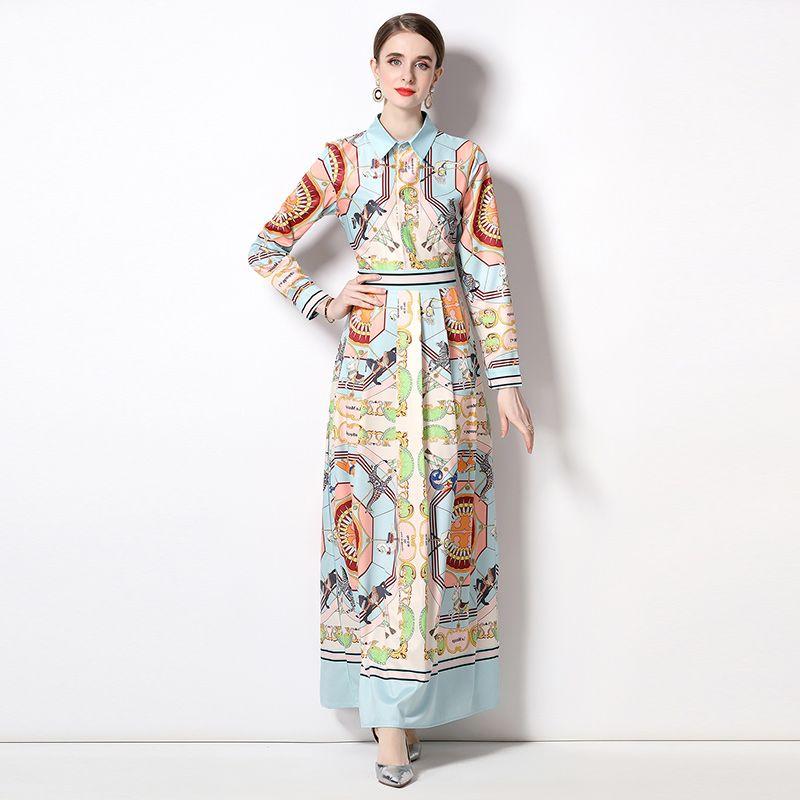 Весенне-осеннее брендовое дизайнерское платье для подиума с принтом, женские однобортные платья макси с воротником с лацканами и длинными рукавами до щиколотки
