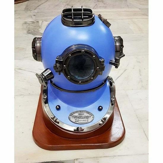 Этот 45,72-сантиметровый антикварный шлем морской пехоты США Mark V Deep Sea Scuba Divers Heavy Duty весит около 8 кг и выполнен в прочном синем цвете с черным хромом.
