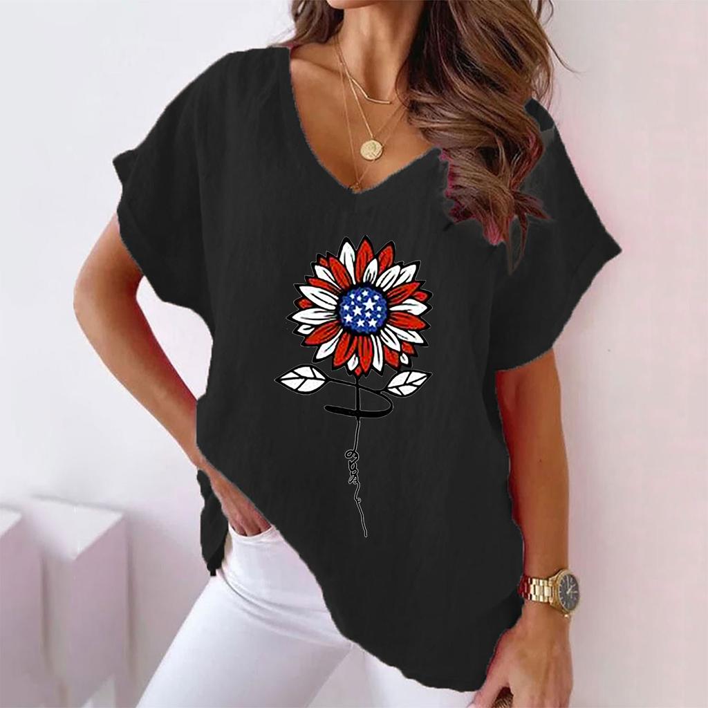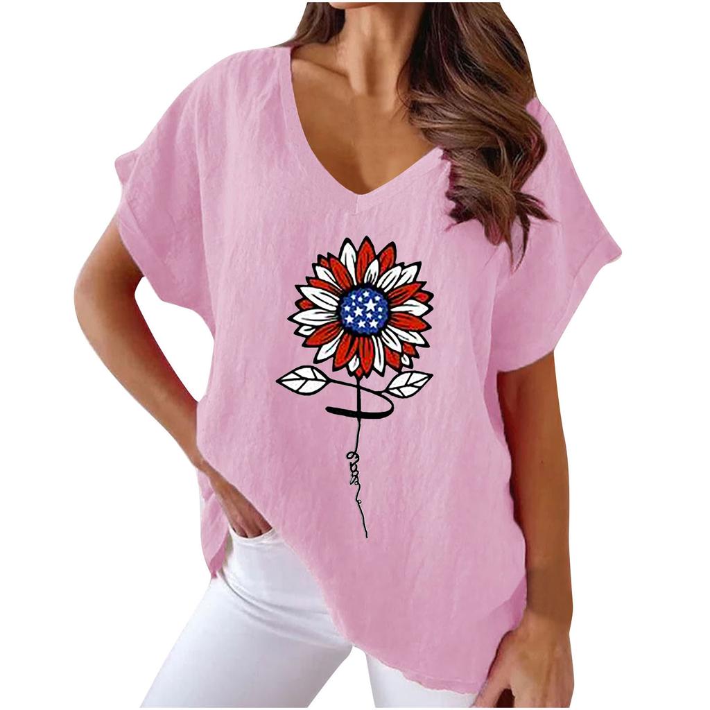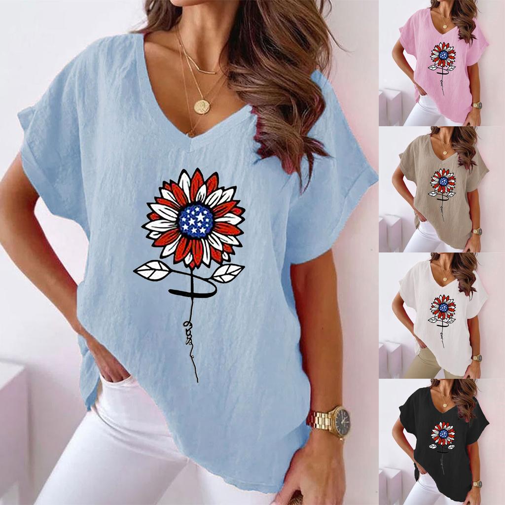 Лето 2023, женская повседневная хлопковая футболка с v-образным вырезом и цветочным принтом из конопли «летучая мышь»