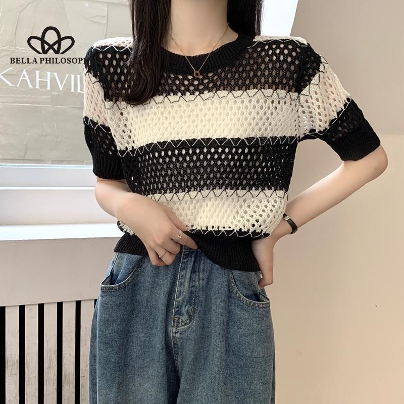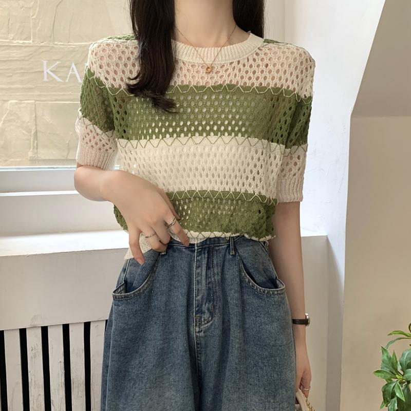 Ретро полосатая вязаная блузка с короткими рукавами и короткими рукавами, женский свитер с круглым вырезом, женская модная одежда