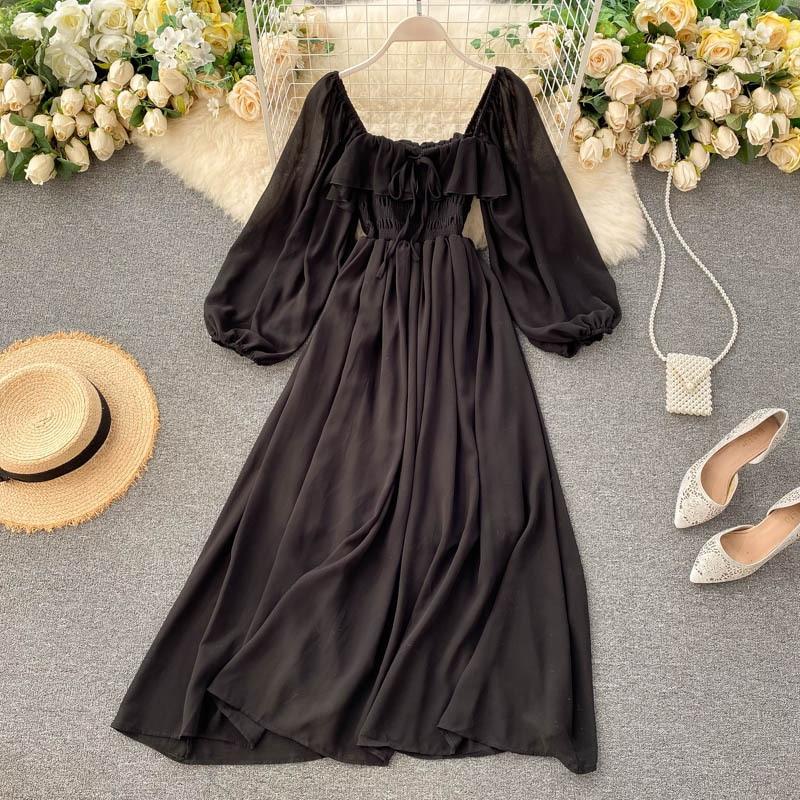 Винтажное длинное платье с квадратным воротником, женские вечерние платья с эластичной резинкой на талии, модное шифоновое платье с пышными рукавами, женская одежда 20223