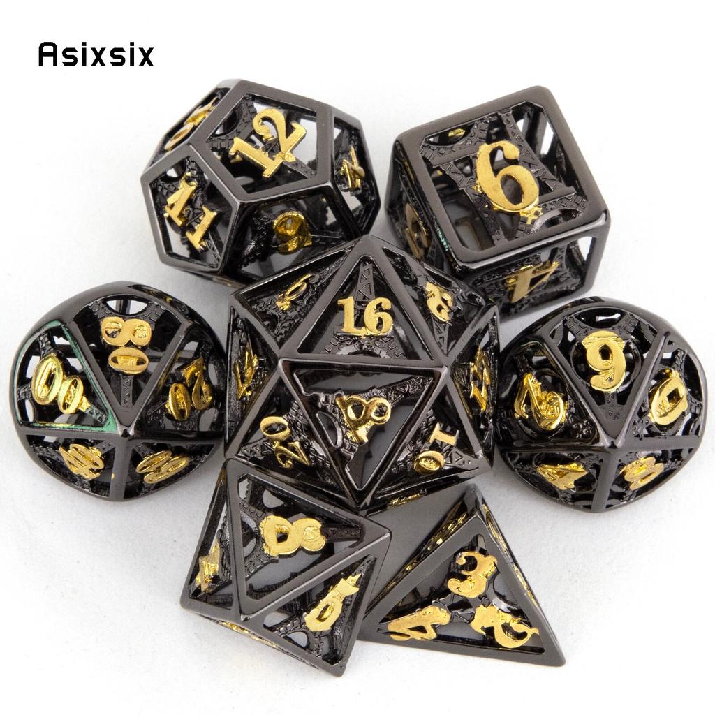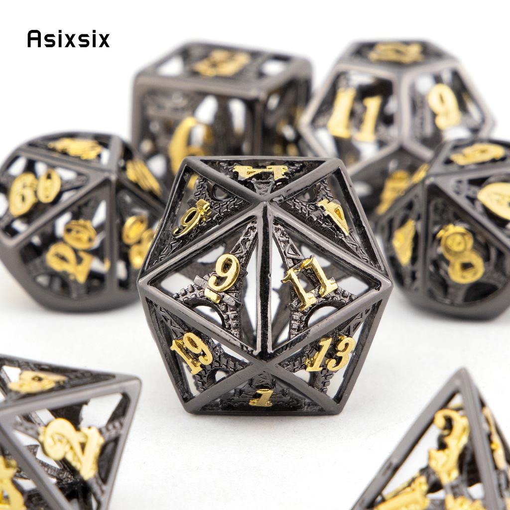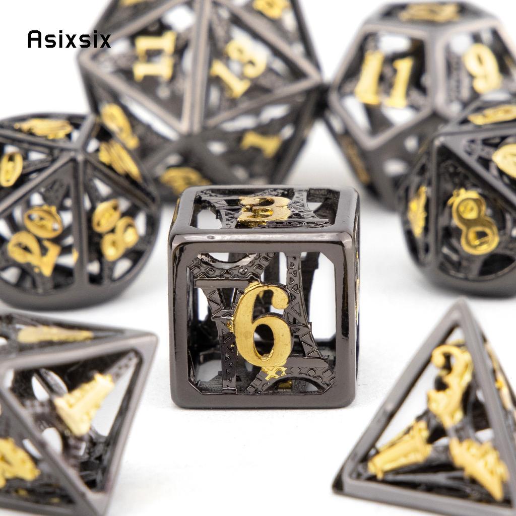7 шт., черные, золотые, металлические кубики с башней, набор полых металлических многогранных кубиков, подходящий для ролевой игры, настольной игры, карточной игры