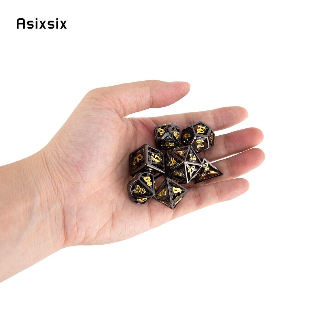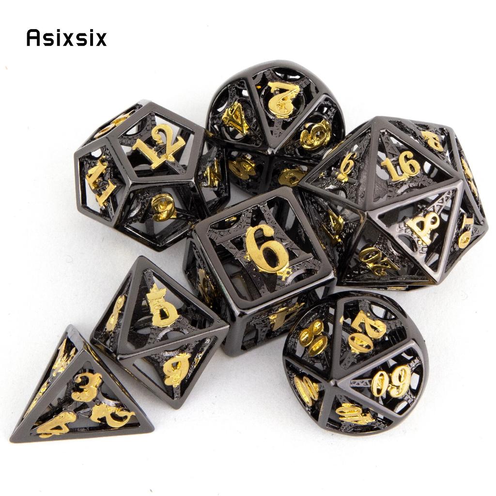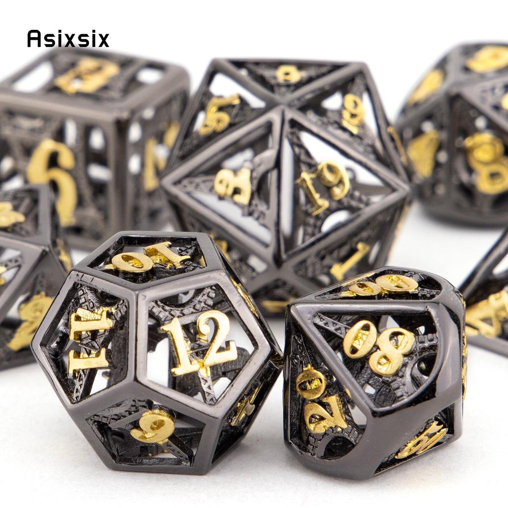 7 шт., черные, золотые, металлические кубики с башней, набор полых металлических многогранных кубиков, подходящий для ролевой игры, настольной игры, карточной игры