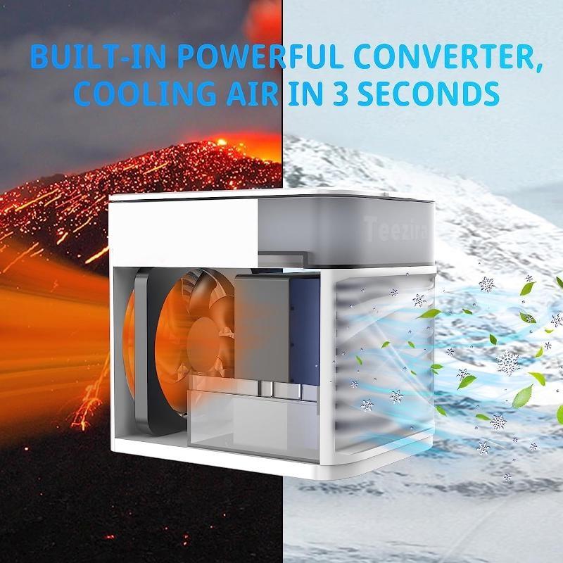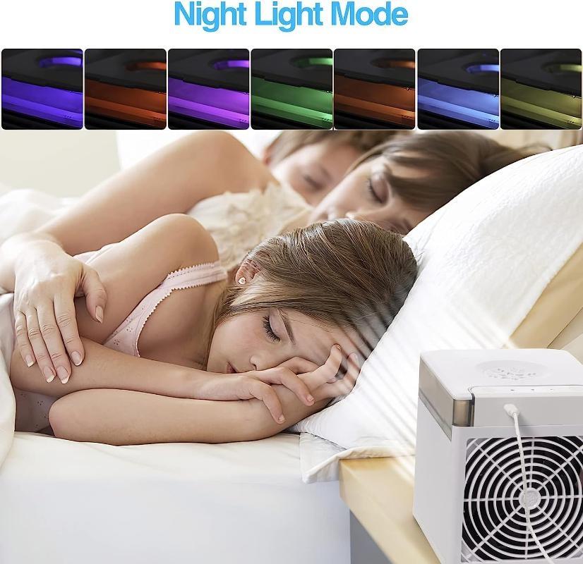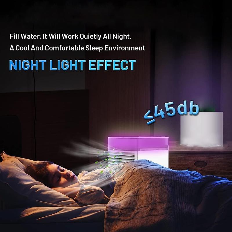 【ЭФФЕКТИВНОЕ ОХЛАЖДЕНИЕ 4-В-1】:Этот персональный кондиционер включает в себя вентилятор, увлажнители, охладитель распыляемого воздуха и функции ночника.Персональный воздухоохладитель 4 в 1 Design является энергоэффективным и экономичным, прекрасно помещается на офисном столе, столе или тумбочке, где бы вам это ни понадобилось. Независимо от того, находитесь ли вы дома, в офисе или на улице, его можно легко носить с собой куда угодно, чтобы помочь превратить горячий, сухой воздух в прохладный, освежающий воздух, охладив вас жарким летом.