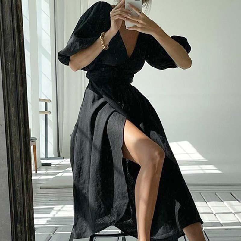 Плиссированное сексуальное вечернее платье с пышными рукавами и разрезом, женское элегантное однотонное летнее платье с v-образным вырезом, повседневное длинное платье на шнуровке, Vestidos 27998