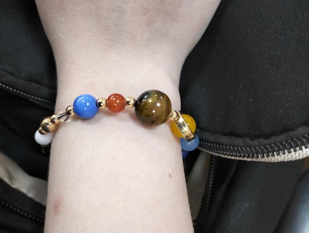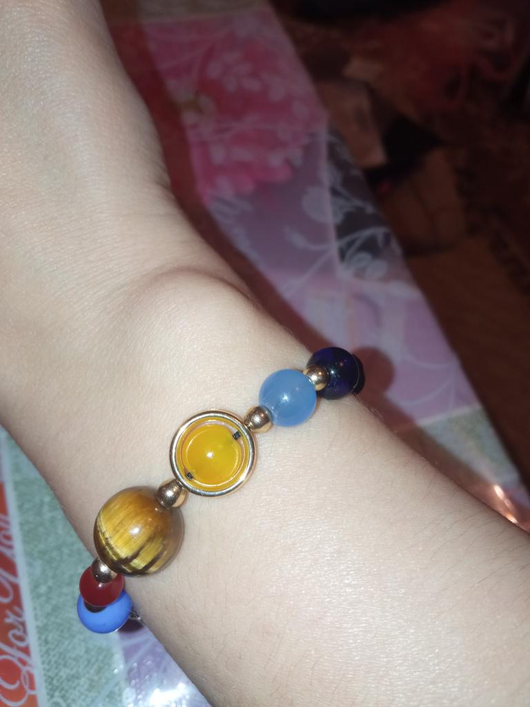 Симпатичный браслетик с планетами, затягивается по руке верёвочками, планетки - камешки, смотрится оригинально, без повреждений, продавцу спасибо🤗, рекомендую🥰