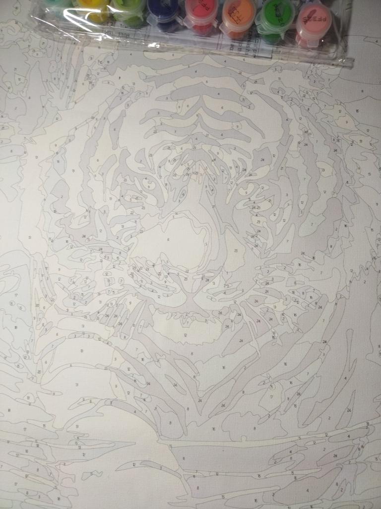 Все в комплекте есть краски,кисти ,холст.Холст 40 на 48 +по 3см.с каждой стороны на натяжку на подрамник.Один моментик не понравился.В прошлый раз заказывала пейзаж и холст пришел скрученный в трубочку а тут сложенный .Придется держать под прессом