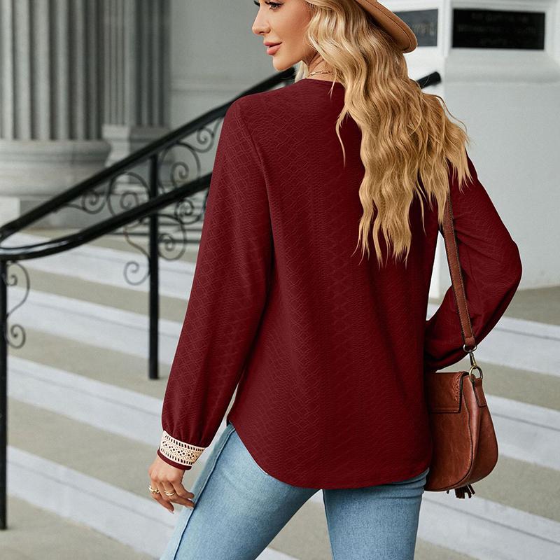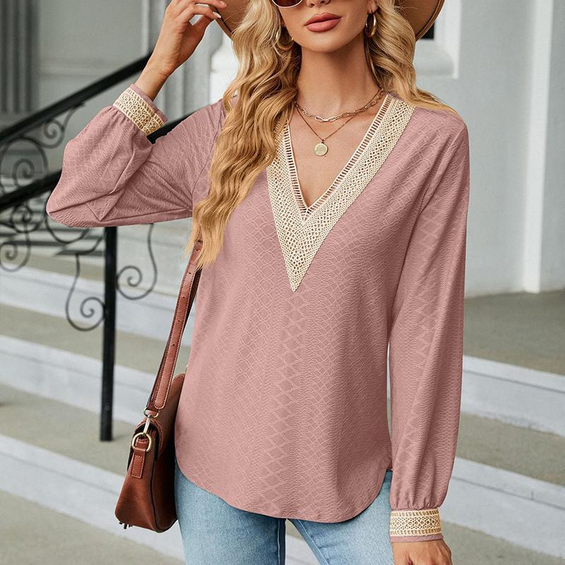 Женская блузка из мерсеризованного хлопка с глубоким V-образным вырезом, кружевная рубашка, однотонные повседневные топы с длинными рукавами