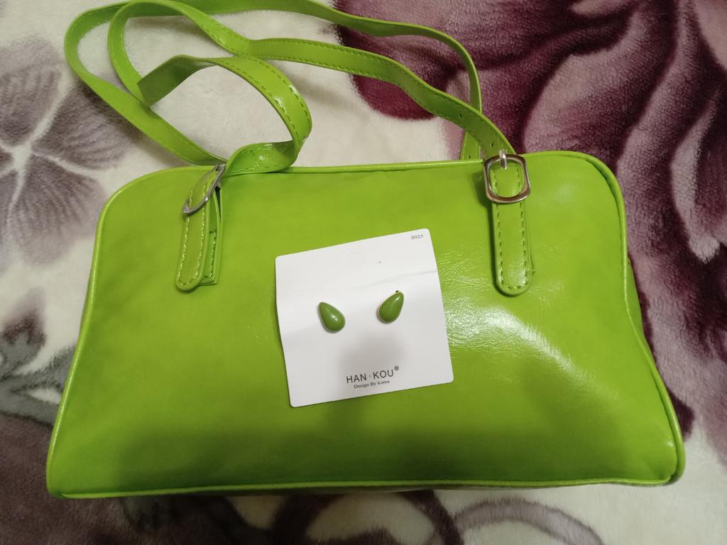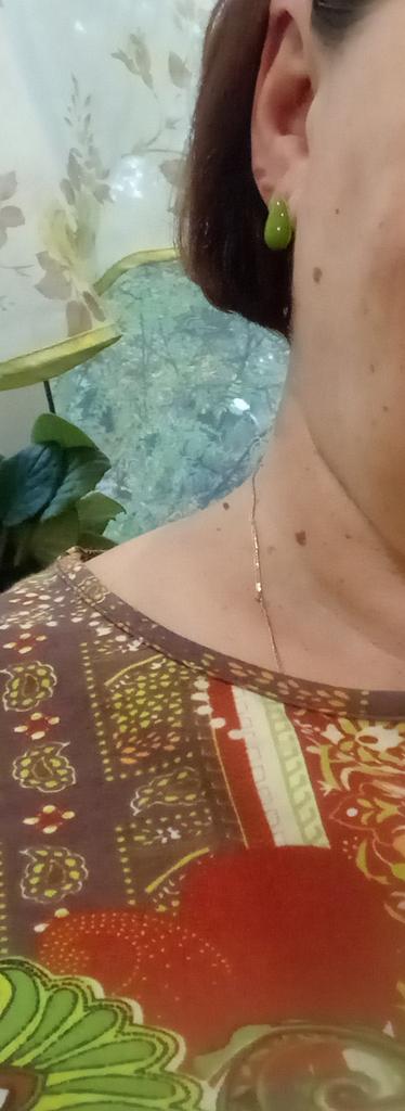 Серьги- гвоздики каплевидной формы, покрытые эмалью. Цвет салатовый. Простенькие, лёгкие, небольшие. Я купила на лето. Подбирала по цвету к сумке. Всё как и хотела. Спасибо.