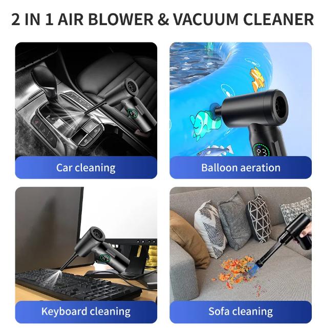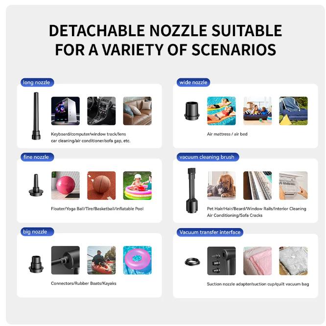 【Мощная система пылесоса】: Для различных сценариев: Вы можете очистить от крошек, волосков, пыль с ПК, клавиатуры, дивана, кондиционера, объектива камеры или автомобиля и сжечь древесный уголь в барбекю, надуть бассейн, мяч для йоги. Вы также можете использовать его в качестве вакуумного упаковщика для откачки воздуха из пакетов для хранения, чтобы сэкономить место.