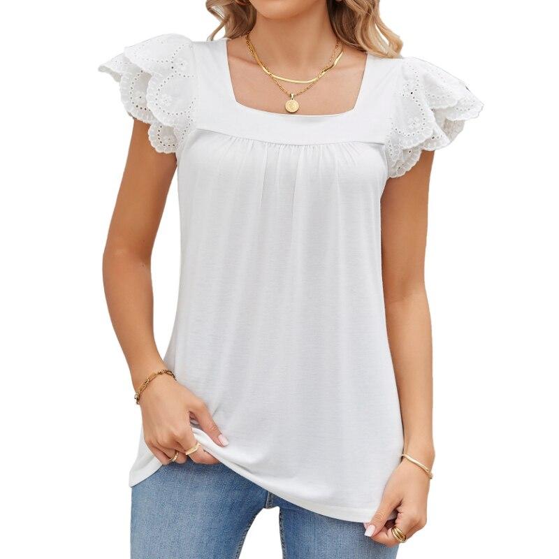 Элегантная повседневная футболка с короткими рукавами и лепестками, женская блузка с квадратным воротником, лето 2023, полый однотонный стильный простой топ для женщин 27773