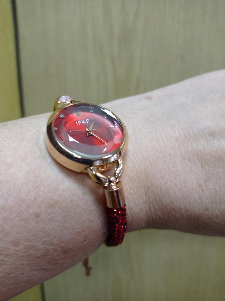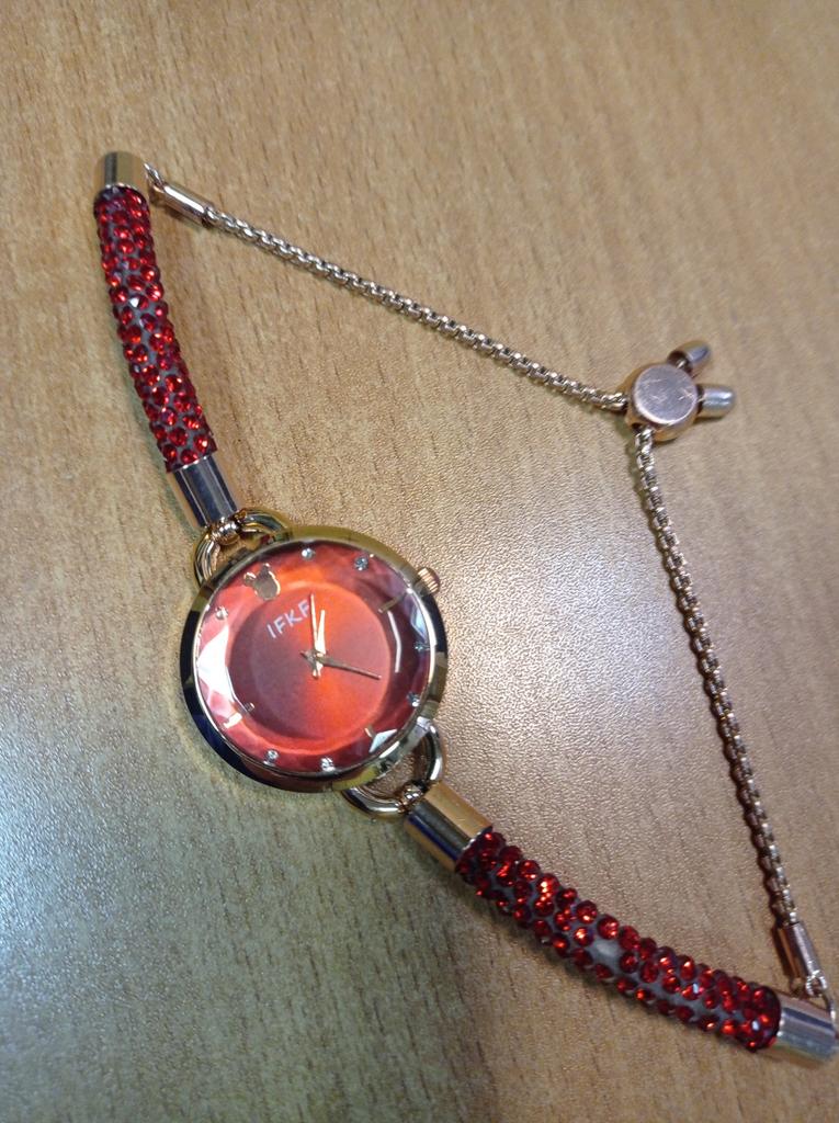 Часики неплохие,на лето самое то!Камушки все на месте,при свете переливаются.Присутствуют немного следы клея и легкий запах химии,но думаю выветриться.Часики идут,что уже очень радует!Три кнопки на запястье,но все-равно считаю,что на полные ручки будут маловаты.Шли месяц до Оренбургской области.