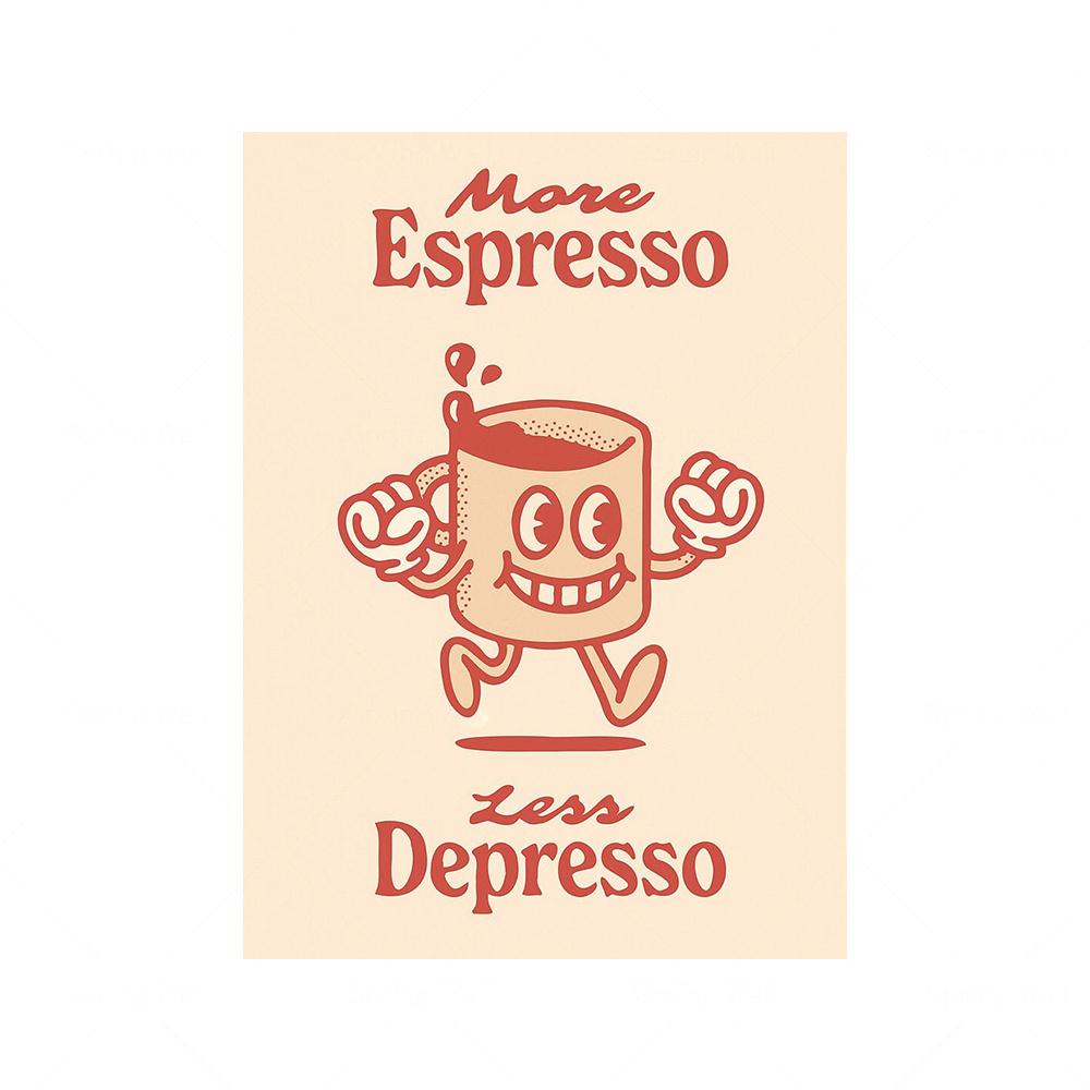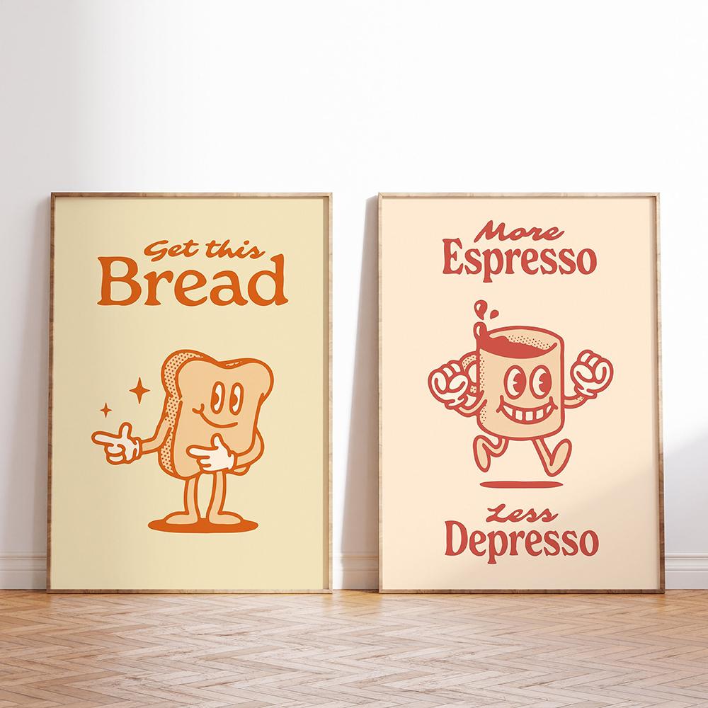 Больше эспрессо Меньше Депрессо Хлеб Плакат Печать Проигрыватель Ретро Мультфильм Персонаж Холст Картина Настенная Картина Декор Комнаты