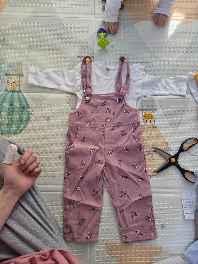 Кофточка - хб, комбинезон- тоненькая джинса; но очень приятная. Заказала размер 6-12 месяцев, пришло по ростовке 90. Нам на вырост самое то. Нитки не торчали, качество топ