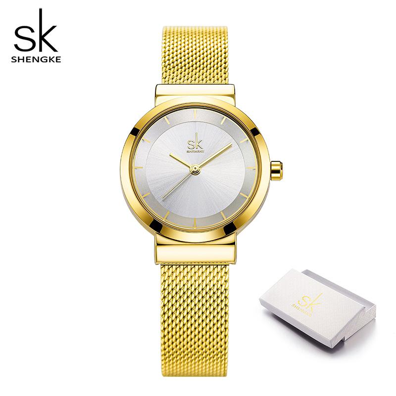 SHENGKE Роскошные брендовые золотые часы, женские элегантные кварцевые наручные часы с бриллиантами для женщин, часы со стальной сеткой