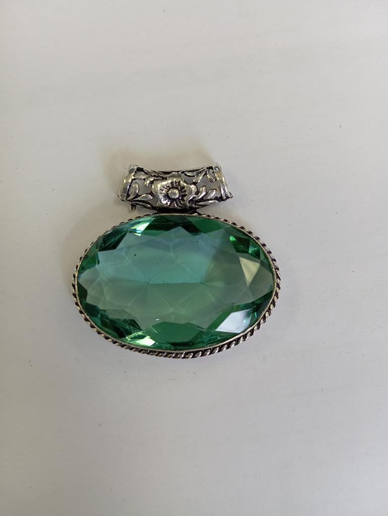 Шел слишком долго, от склада продавца до ближайшего отделения индийской почты почти месяц, наверно рикши совсем обленились или начали черепах привлекать в курьеры. Красивый, увесистый, камень зеленый аметист хорошего качества, чистой воды, закатан в оправу добротно - не выпадет. Но на верхней грани камня небольшая выбоина, держатель для цепочки припаян криво и не посередине кулона, смещение на пару мм. Даже как-то обидно за страну с такими богатыми ювелирными традициями. Наверное ученики на нас тренируются.